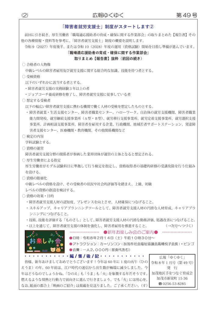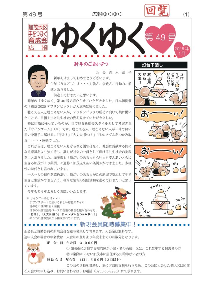 広報「ゆくゆく」第49号完成 2025年12月25日 最終更新日時 : 2025年12月25日 kamoiku-suzuki 広報「ゆくゆく」第49号が完成しました。現在印刷中です。 1月15日の回覧版にて加茂市民の方々へ回覧させていただきます。 会員の皆様へは、個別にお届けいたします。 FacebookXBlueskyHatenaCopy