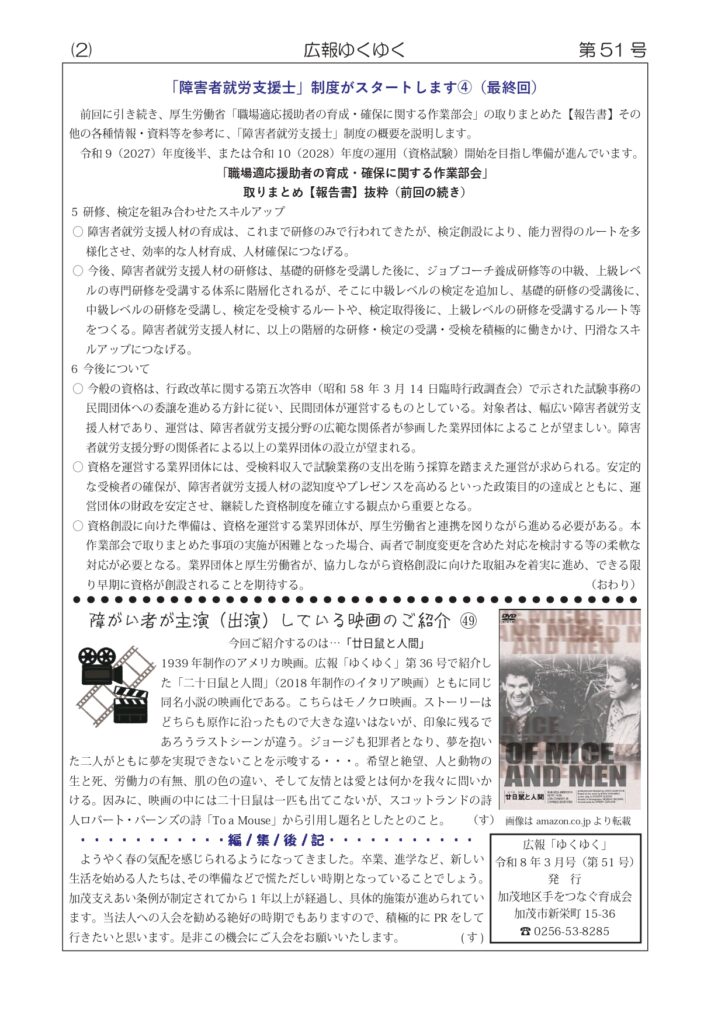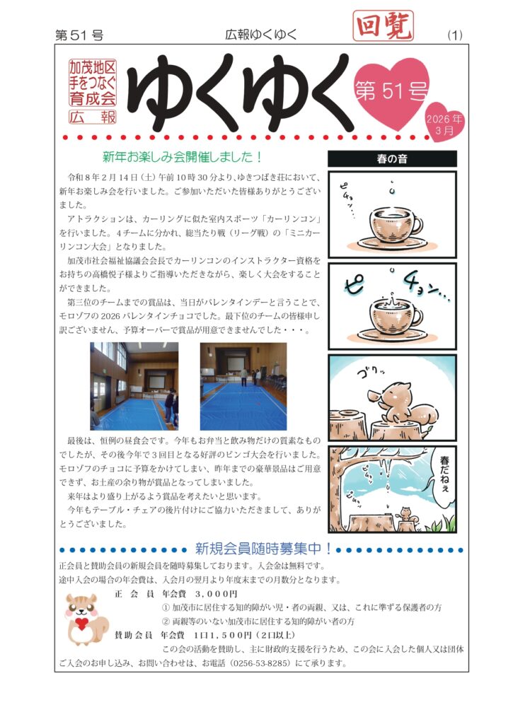 広報「ゆくゆく」第51号完成 2026年3月1日 最終更新日時 : 2026年3月1日 kamoiku-suzuki 広報「ゆくゆく」第51号が完成しました。現在印刷中です。 3月16日の回覧版にて加茂市民の方々へ回覧させていただきます。 会員の皆様へは、個別にお届けいたします。 FacebookXBlueskyHatenaCopy